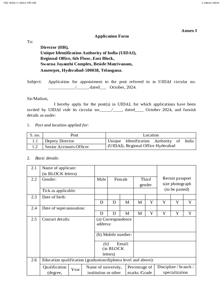 Get the free Application Form for Appointment in Uidai
