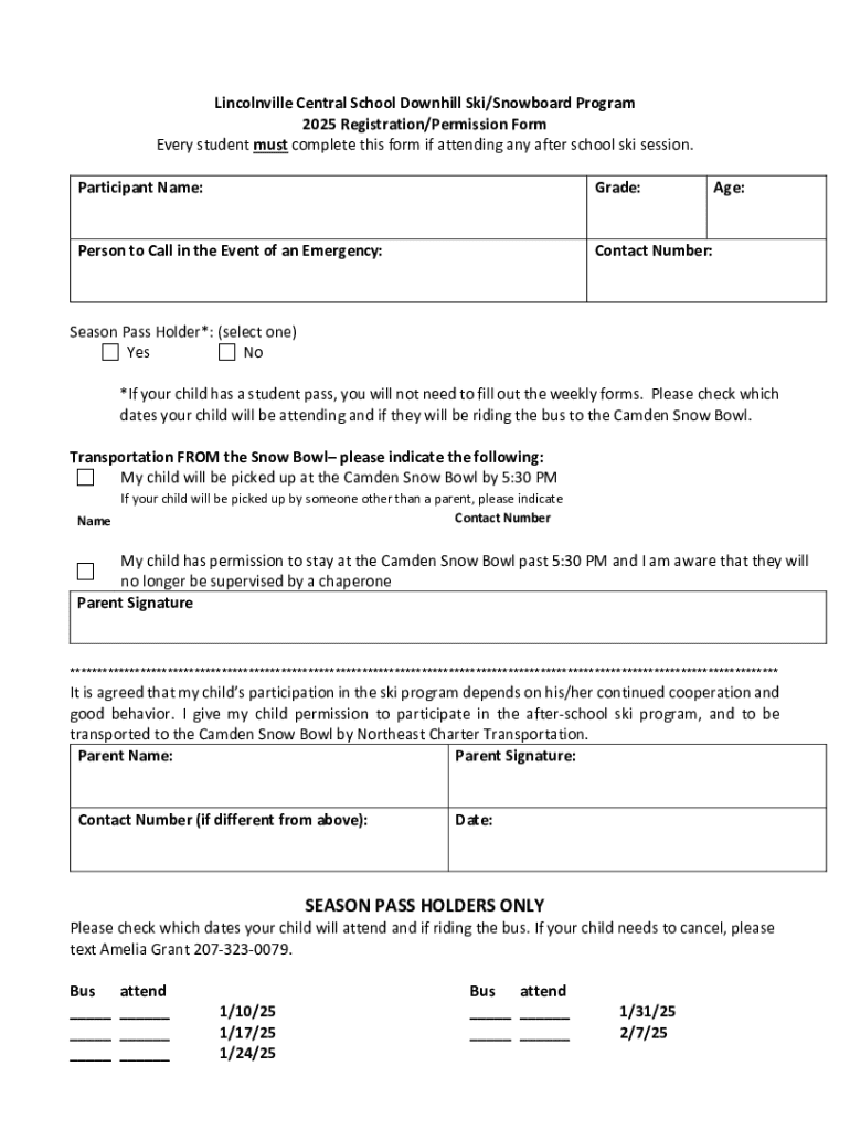 Filling out the Lincolnville Central School downhill form requires several key pieces of information. The sections typically include student details, parent or guardian information, and emergency contact data. It is crucial that all fields are filled out accurately to avoid misunderstandings or delays.