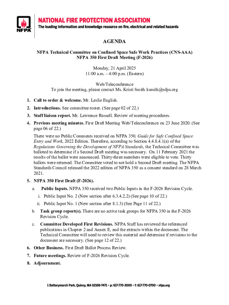 Agenda for the NFPA Technical Committee on Confined Space Safe Work Practices, outlining meeting details, minutes review, public input discussions, and planning for the NFPA 350 Standard revisions.