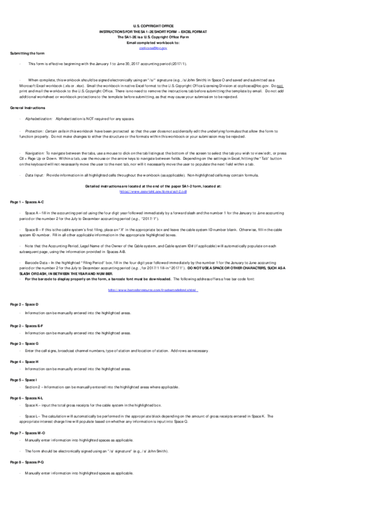 This document provides instructions for completing the SA1-2E short form used for reporting secondary transmissions and royalty fees for cable systems to the U.S. Copyright Office.