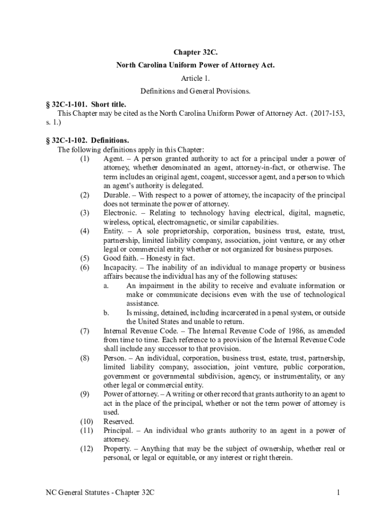 The North Carolina Uniform Power of Attorney Act (Chapter 32C) provides a standardized legal framework for establishing and executing power of attorney. This legislation was enacted to clarify the responsibilities and rights of both agents and principals, thus enhancing the legal validity of power of attorney documents. The Act ensures that individuals understand their rights when appointing someone to act on their behalf and provides agents with clear guidelines to follow.