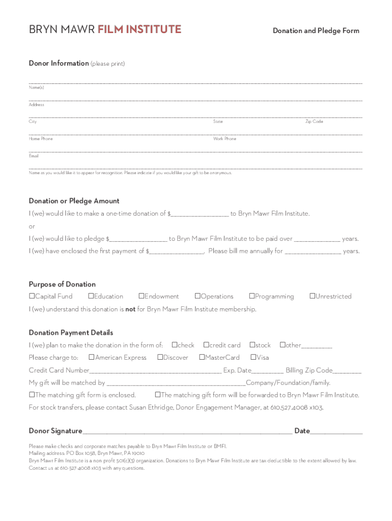 Get the free Bryn Mawr Film Institute Donation and Pledge Form