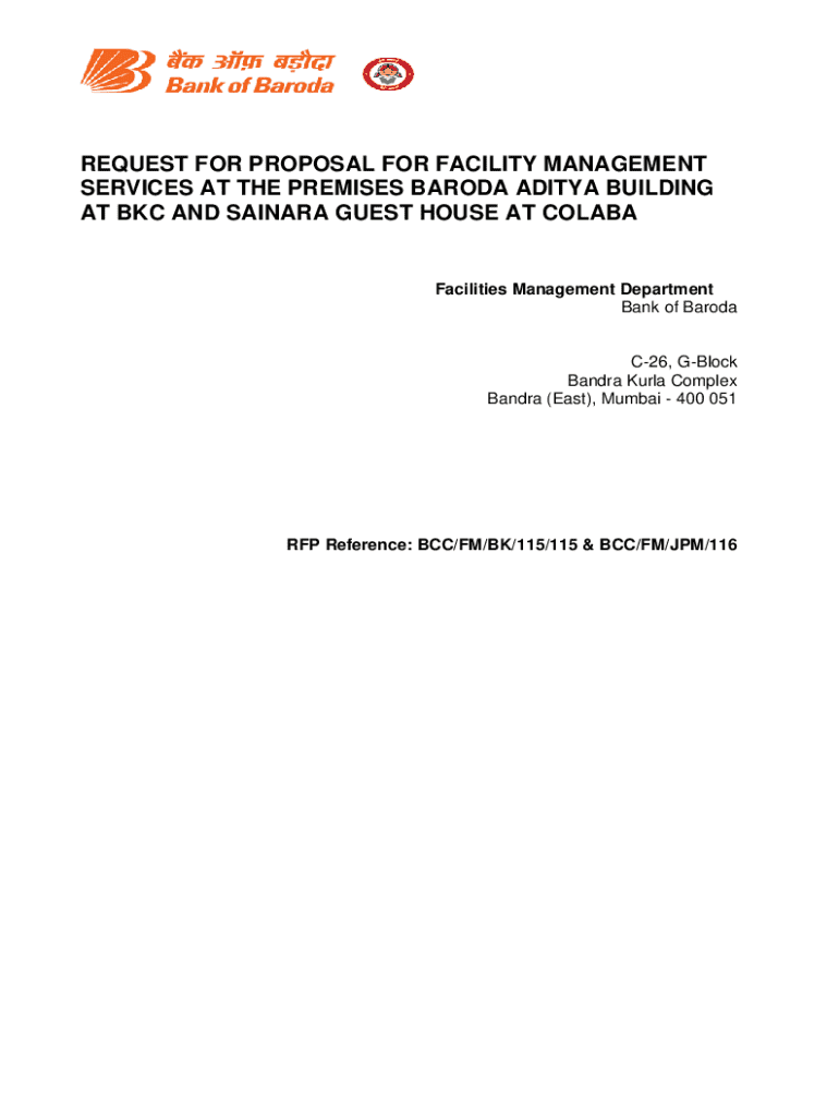 Get the free Request for Proposal for Facility Management Services at the Premises Baroda Aditya ...