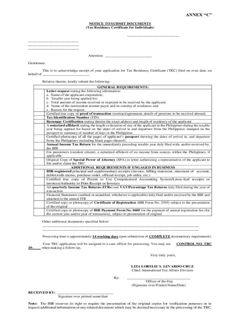 Get the free Notice to Submit Documents (tax Residency Certificate for Individuals)
