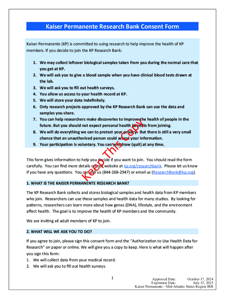 Get the free Kaiser Permanente Research Bank Consent Form