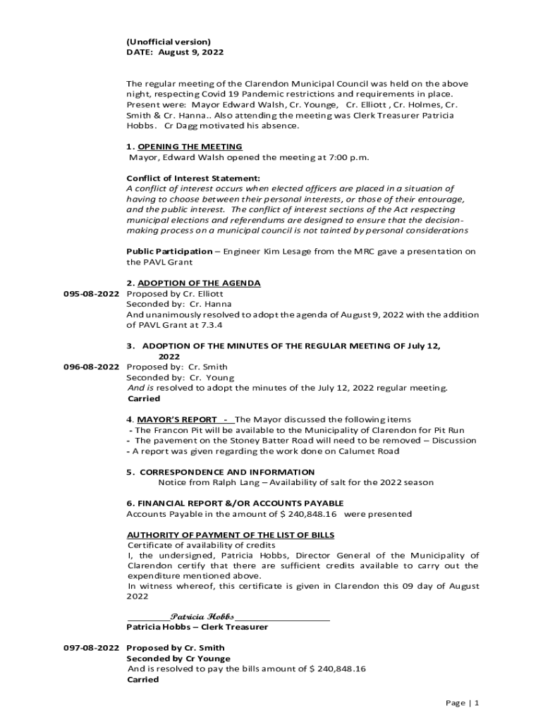 Minutes from the regular meeting of the Clarendon Municipal Council covering various topics, including financial reports, committee discussions, and council resolutions.