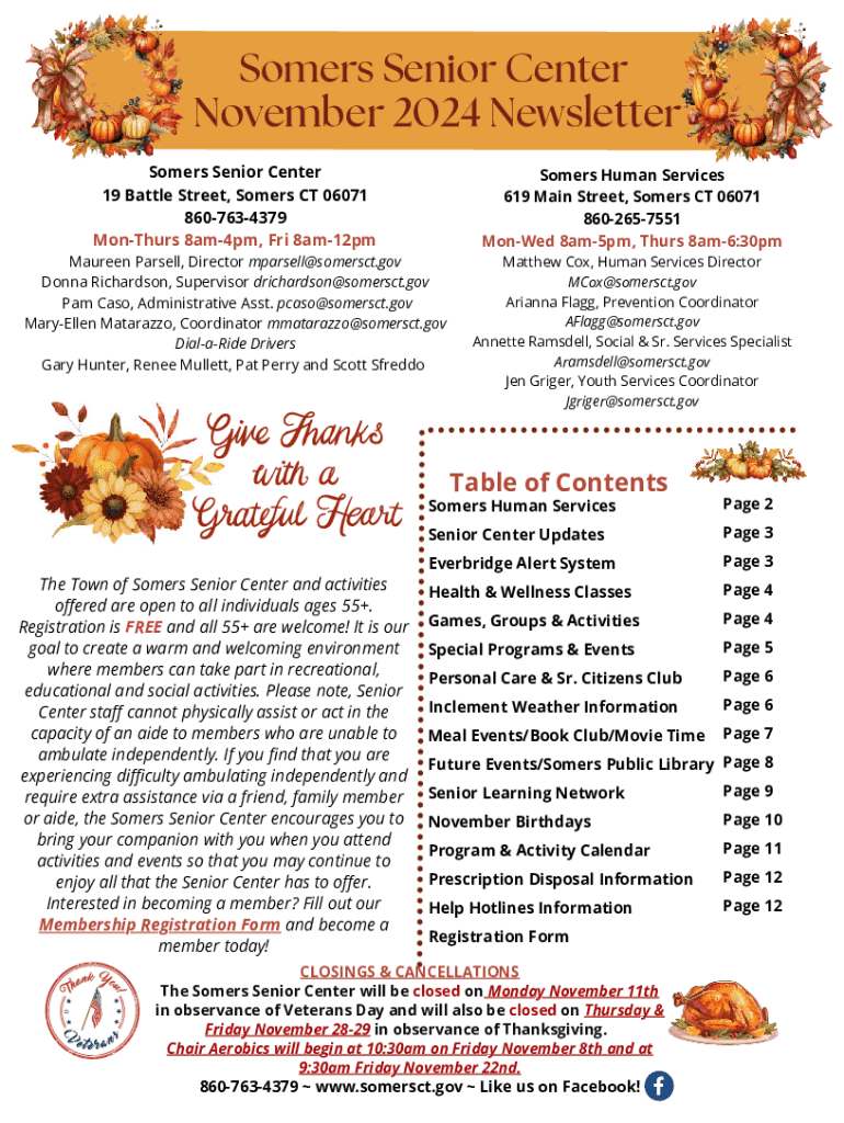 This newsletter outlines the activities, classes, and services provided by the Somers Senior Center, aimed at promoting social engagement, health, wellness, and resources for seniors aged 55 and above.