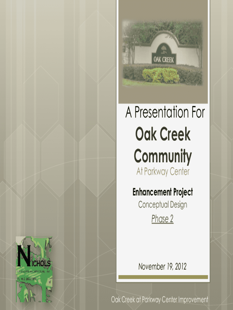 A presentation detailing the conceptual design and planning process for the enhancement of the Oak Creek community at Parkway Center, including landscape architecture and thematic development.