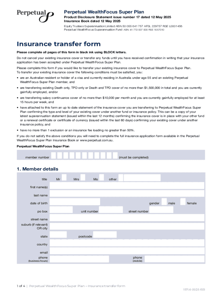 Get the free Perpetual Wealthfocus Super Plan Insurance Transfer Form
