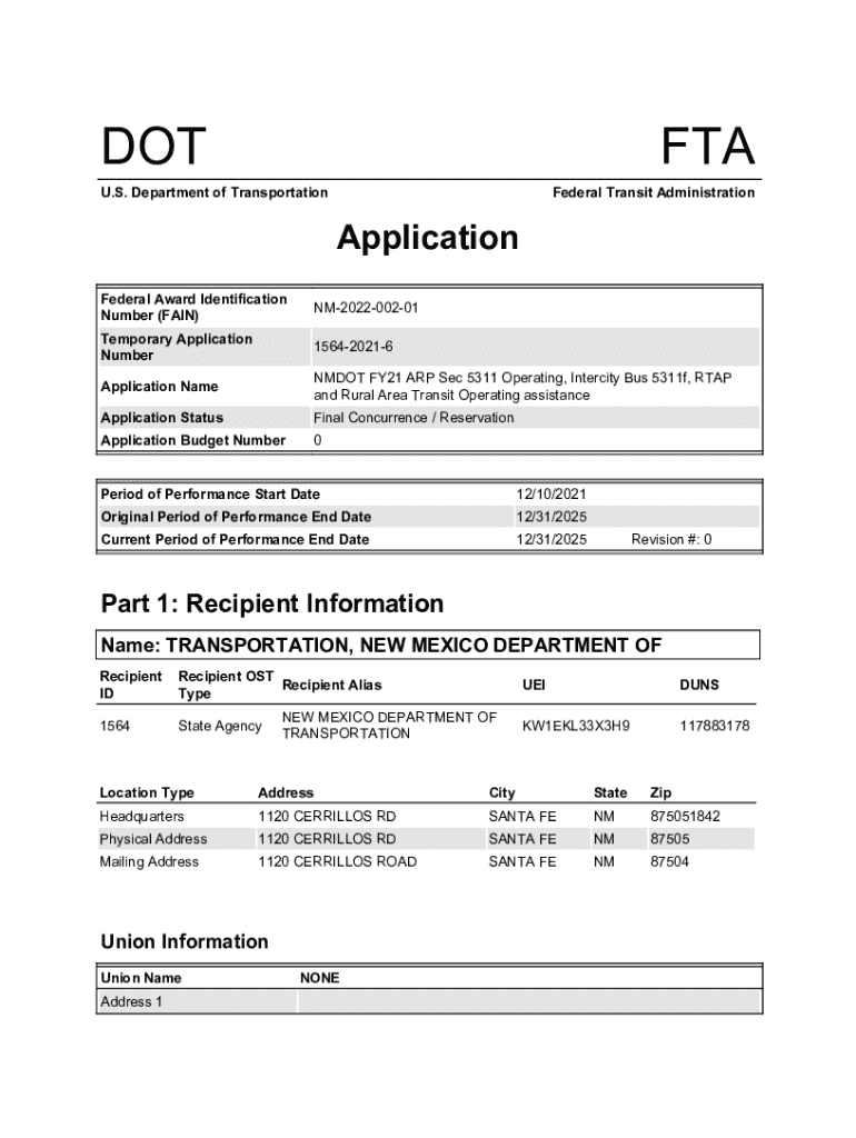 This document is an application for federal funding assistance under the Section 5311 ARP for rural transit agencies in New Mexico, aimed at covering operating expenses and providing services for