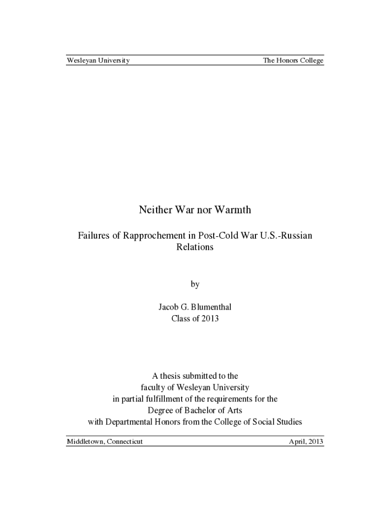 Wesleyan UniversityThe Honors CollegeNeither War nor Warmth Failures of Rapprochement in PostCold War U.S.Russian Relationsby Jacob G. Blumenthal Class of 2013A thesis submitted to the faculty of