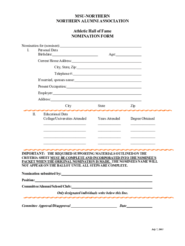 This document is a nomination form for candidates to be considered for induction into the Northern Alumni Association Athletic Hall of Fame, including personal, educational, and athletic information