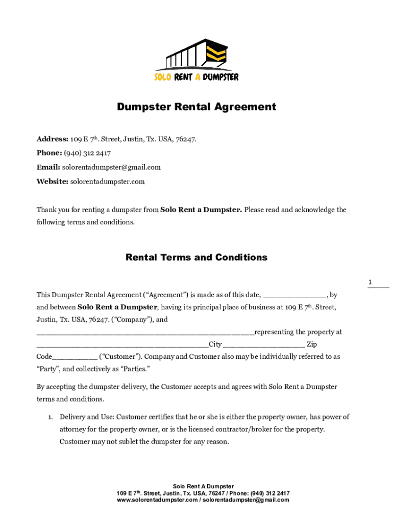 This document outlines the terms and conditions for renting a dumpster from Solo Rent a Dumpster, including rental fees, responsibilities for damage and cleanup, prohibited substances, and payment