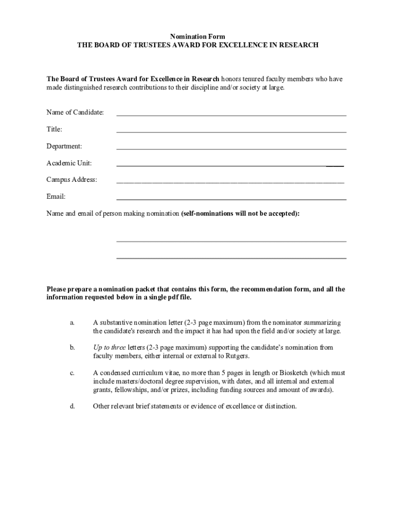 Get the free Nomination Form for the Board of Trustees Award for Excellence in Research - academi...