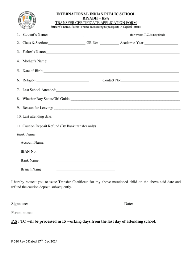 Get the free Transfer Certificate Application Form