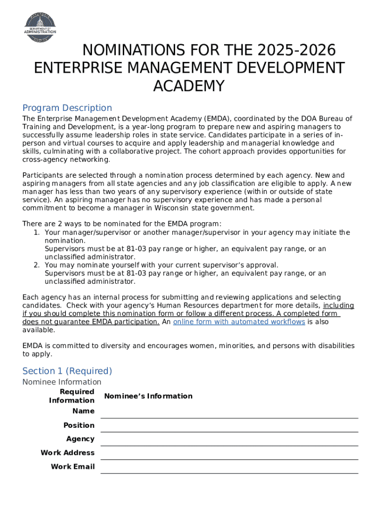 Instructions for the form Nominations for the 2025-2026 Enterprise Management Development Academy