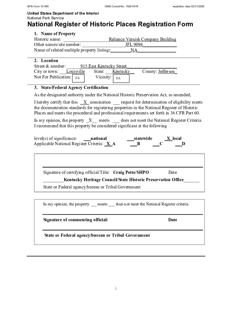 The document is a registration form for the National Register of Historic Places, detailing the Reliance Varnish Company Building located in Louisville, Kentucky. It includes historical significance,