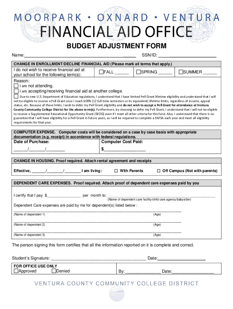 This document is used for requesting adjustments to financial aid and reporting changes in enrollment status, expenses, and housing arrangements.