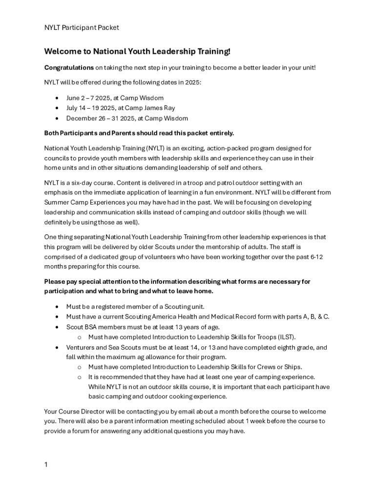The NYLT Participant Packet is a crucial document that captures necessary information for youth attending the National Youth Leadership Training (NYLT). This packet ensures that each participant is adequately prepared for the immersive leadership experience that NYLT offers. By collecting essential details about a participant's background, health, and session choice, the packet facilitates a smoother onboarding process and enhances the overall quality of the program.