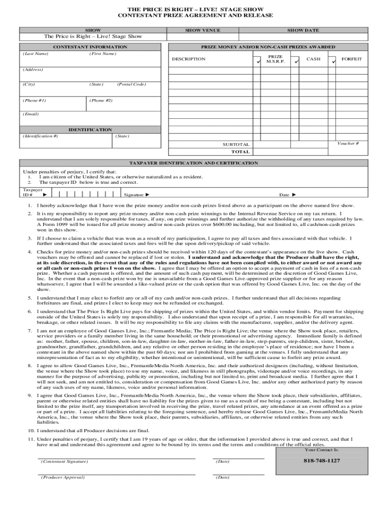 Get the free the Price Is Right – Live! Stage Show Contestant Prize Agreement and Release