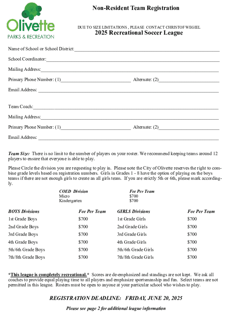 Registro para equipos no residentes en la liga recreativa de fútbol 2025, incluyendo información sobre el registro, equipos, requisitos y horarios.