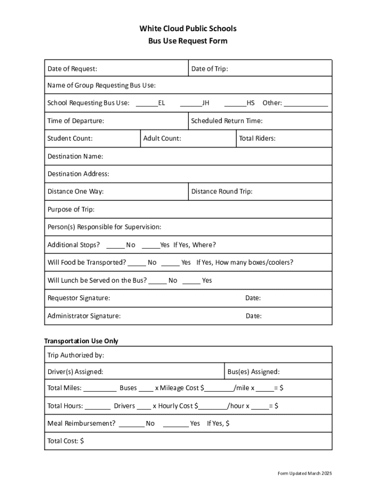 The bus use request form is a vital document used to manage and track transportation requests within organizations, particularly in educational settings. It allows individuals or teams to formally request the use of a bus for various purposes, ranging from field trips to sports events. This systematic approach not only ensures that transportation resources are used efficiently but also streamlines the approval process.