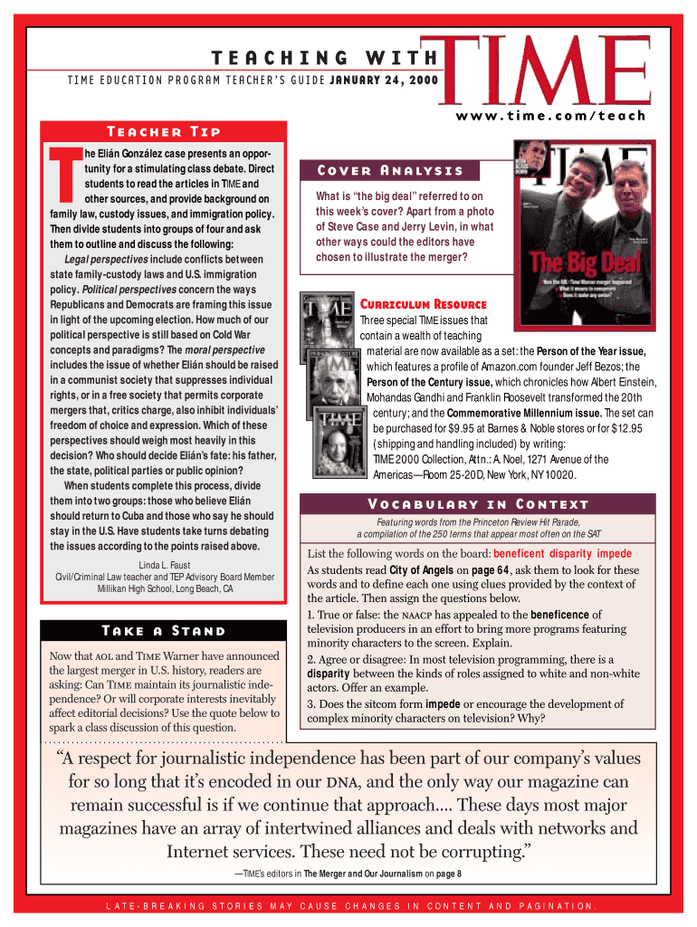 TEACHING WITH TIM E EDUCATION PROGRAM T E AC HE R S G U I D E JA NU A R Y 2 4, 2000 www.time.com/teach Teacher Tip he Eli n Gone led case presents an opportunity for a stimulating class debate. Direct
