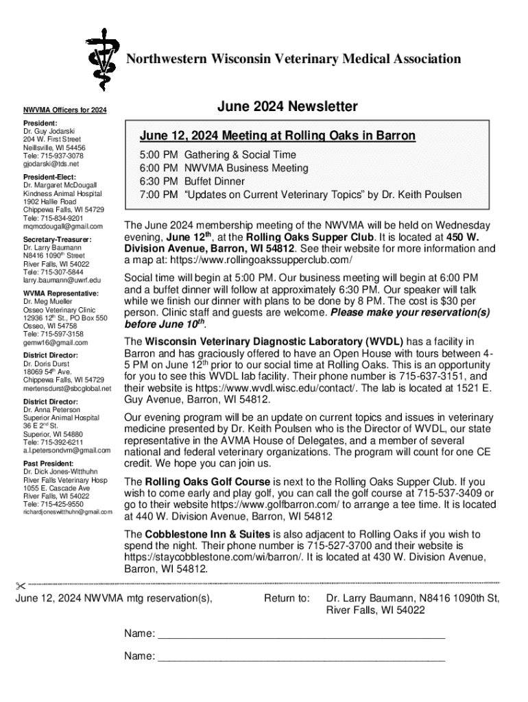 Get the free Northwestern Wisconsin Veterinary Medical Association June 2024 Newsletter
