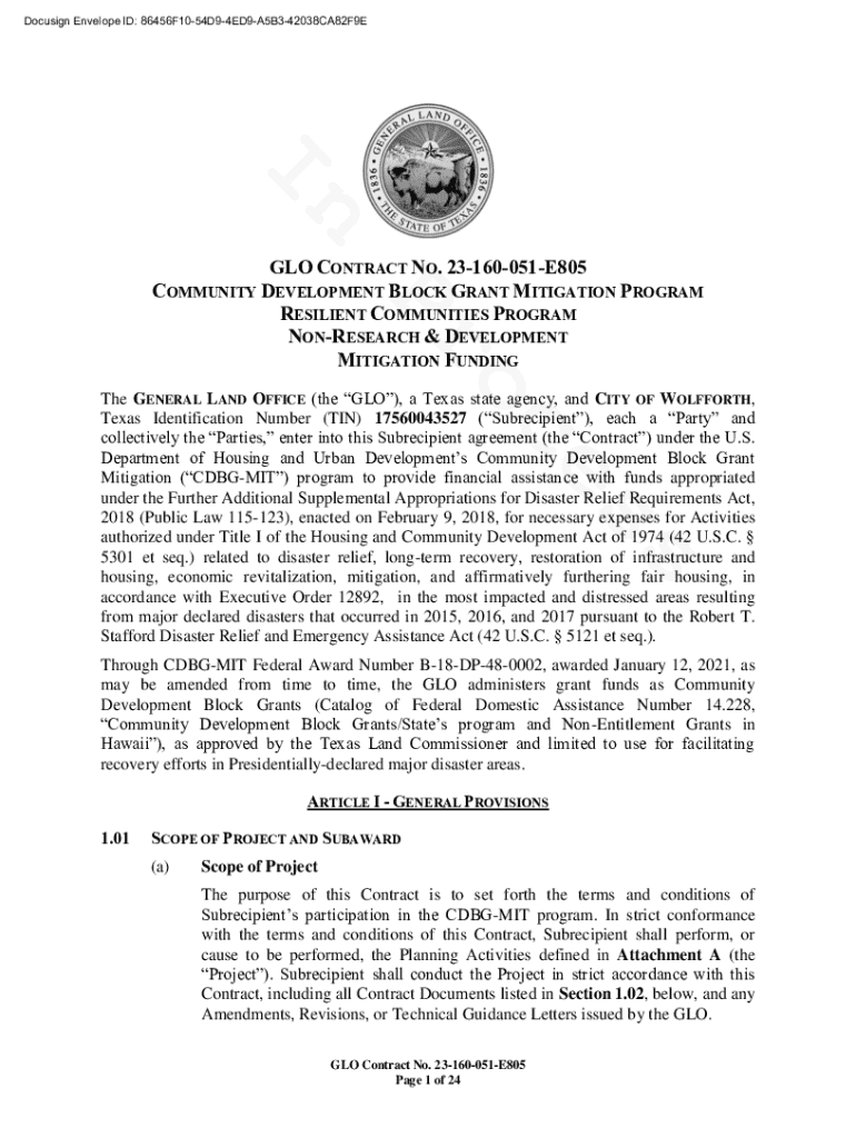This document outlines the Subrecipient agreement between the General Land Office of Texas and the City of Wolfforth for the purpose of implementing the Community Development Block Grant Mitigation