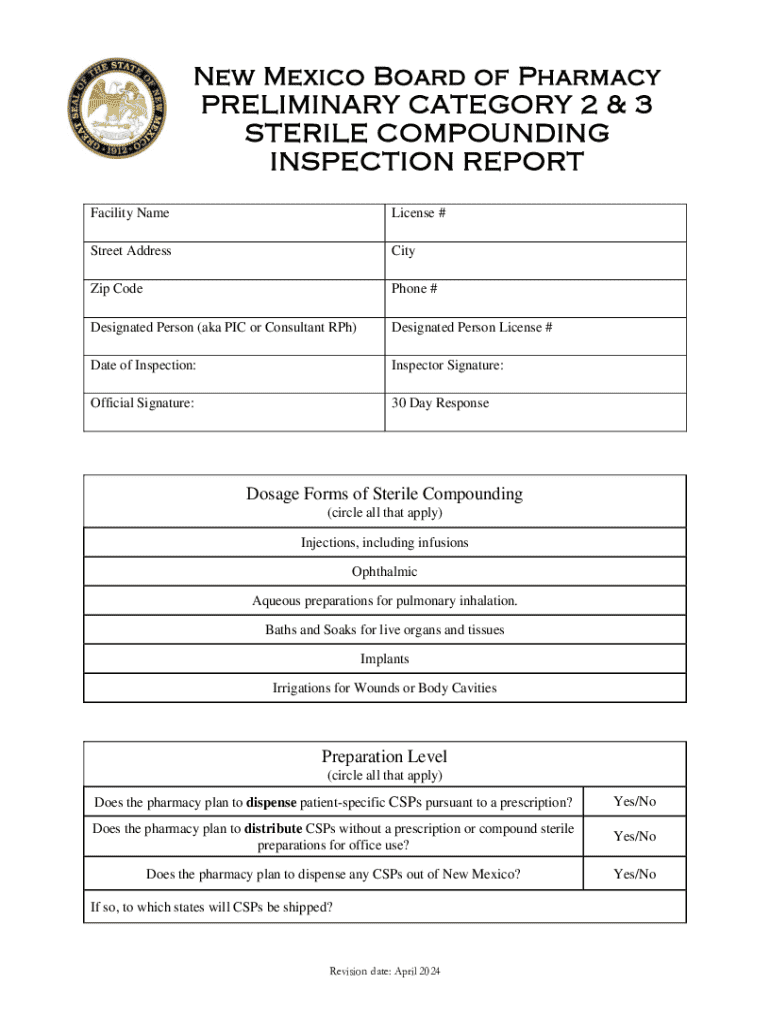 Get the free New Mexico Board of Pharmacy Preliminary Category 2 & 3 Sterile Compounding Inspecti...