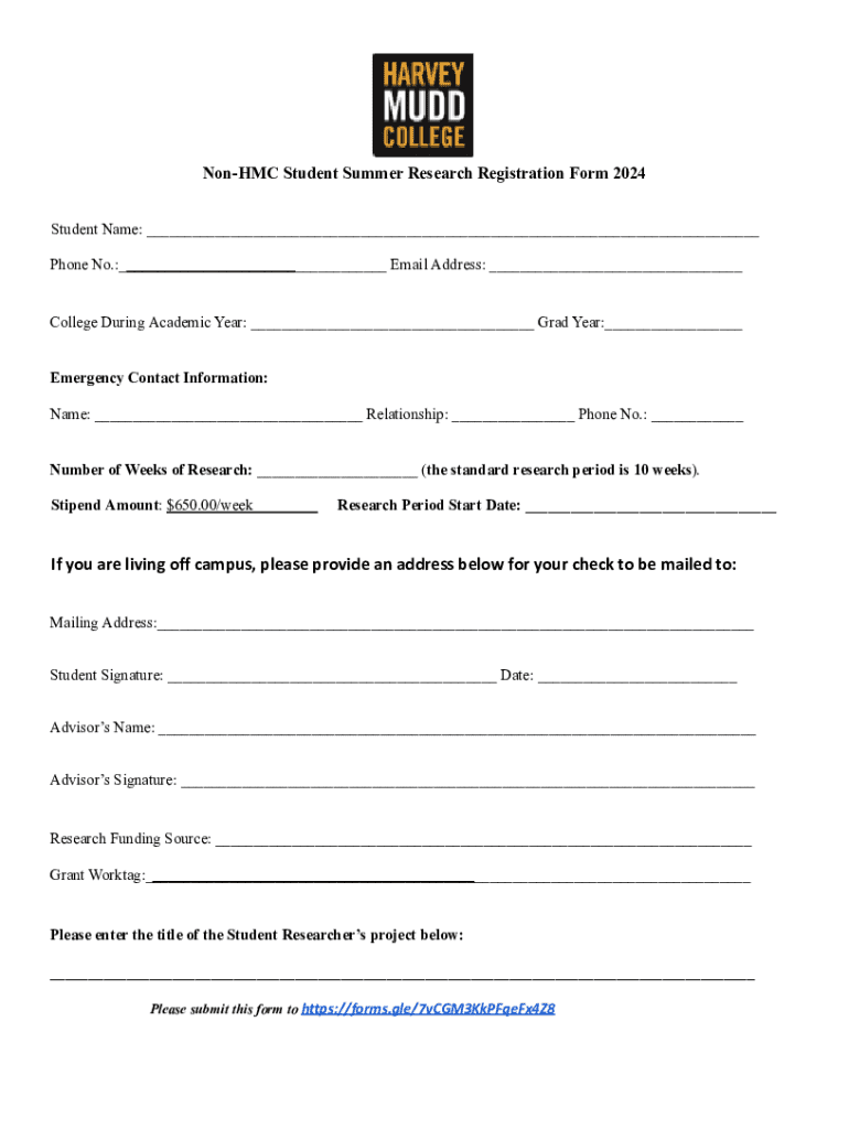 The Non-HMC Student Summer Research Form is a crucial document designed for students seeking research opportunities outside of the Harvey Mudd College (HMC) community. This form plays a pivotal role in facilitating access to valuable summer research experiences, enabling students from various institutions to engage in academic research that can enrich their educational pathways. The importance of submitting an accurate application cannot be overstated; it serves as your introduction to potential mentors and showcases your commitment to pursuing advanced academic inquiries.