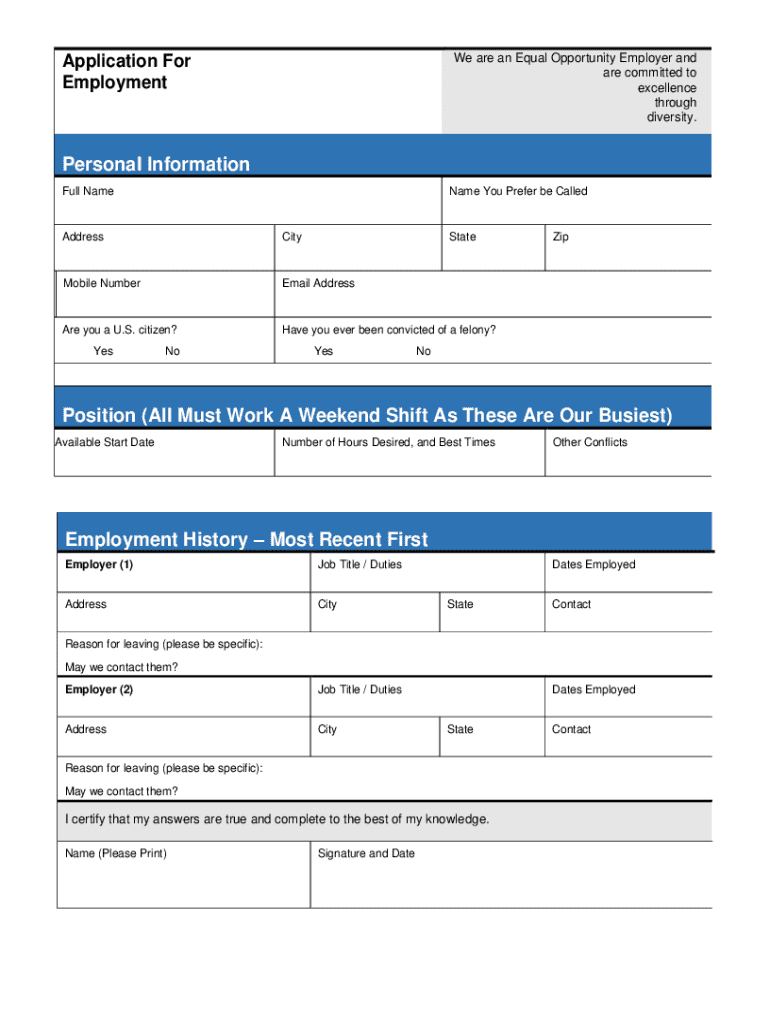 Filling out an application for employment form correctly is crucial. It generally starts with personal information that includes your full name, contact details, and address. This section should be filled out accurately to ensure employers can reach you without difficulty.