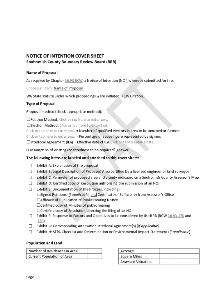 This document serves as a cover sheet for the Notice of Intention (NOI) submitted to the Snohomish County Boundary Review Board, detailing the proposal and required attachments.