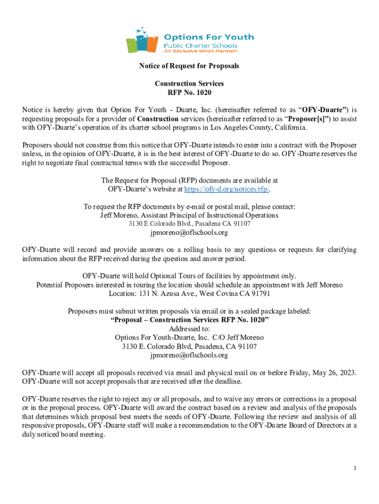 This document serves as a formal notification from Options For Youth - Duarte, Inc. (OFY-Duarte) requesting proposals for construction services to support its charter school programs in Los Angeles