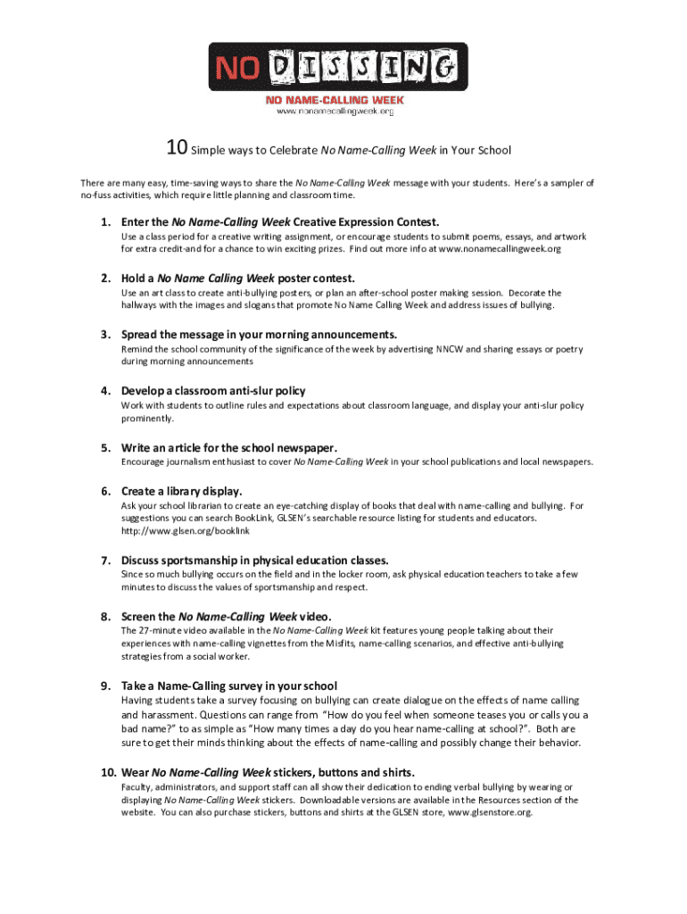 Numerous schools and organizations have effectively utilized the No Name-Calling Week Resource Form, yielding positive outcomes. For example, a high school in California organized a series of workshops that addressed the issue of name-calling through interactive activities and discussions. The impact included increased student awareness and a notable reduction in reported incidents of name-calling.
