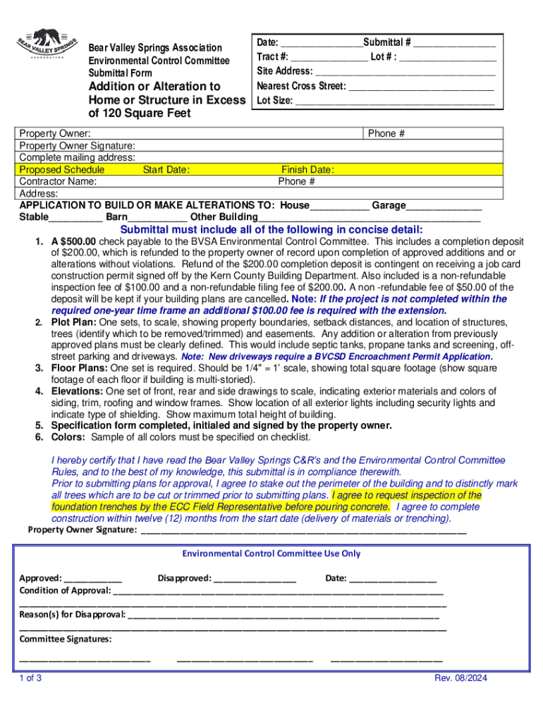 Get the free Bear Valley Springs Association Environmental Control Committee Submittal Form