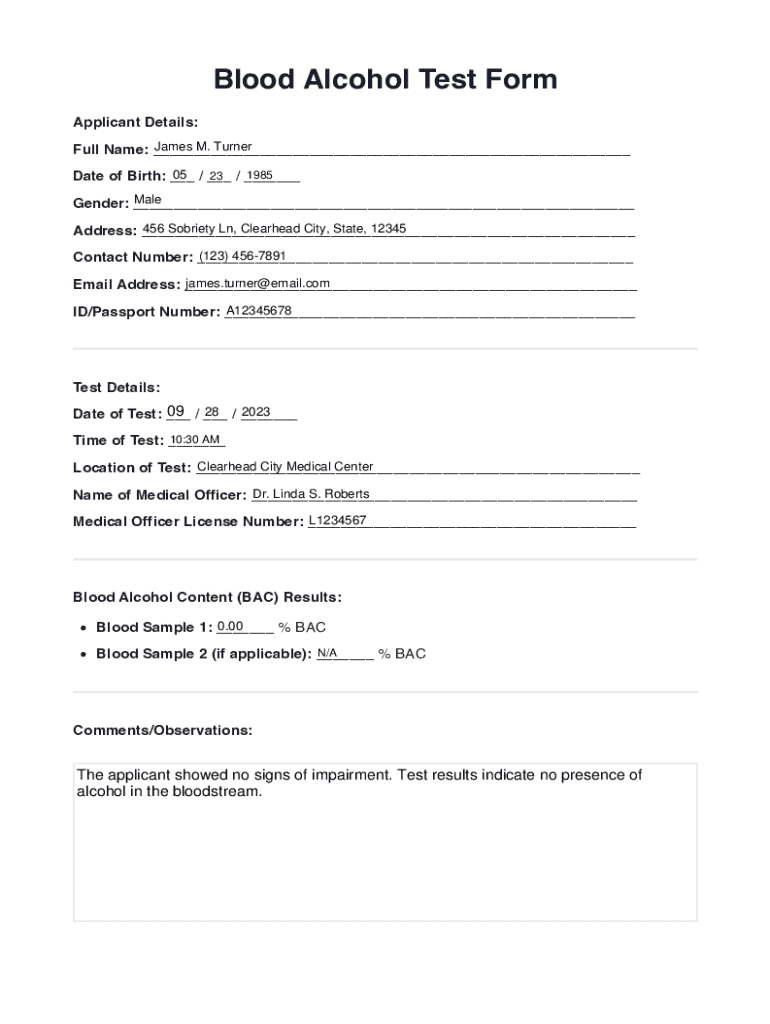 To fill out a blood alcohol test form, provide the patient's personal information, the date and time of the test, the location of the draw, and any relevant medical history, along with the results of the test.
