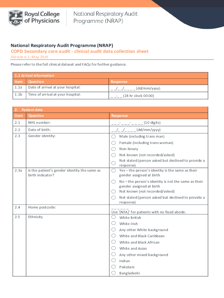 This document serves as a clinical audit data collection sheet for the National Respiratory Audit Programme, focusing on patients with COPD in secondary care settings, detailing information from arrival