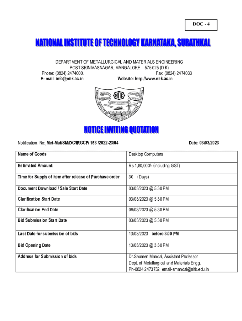 This document invites sealed quotations for the procurement of Desktop Computers for academic and research activities at the National Institute of Technology Karnataka, Surathkal.