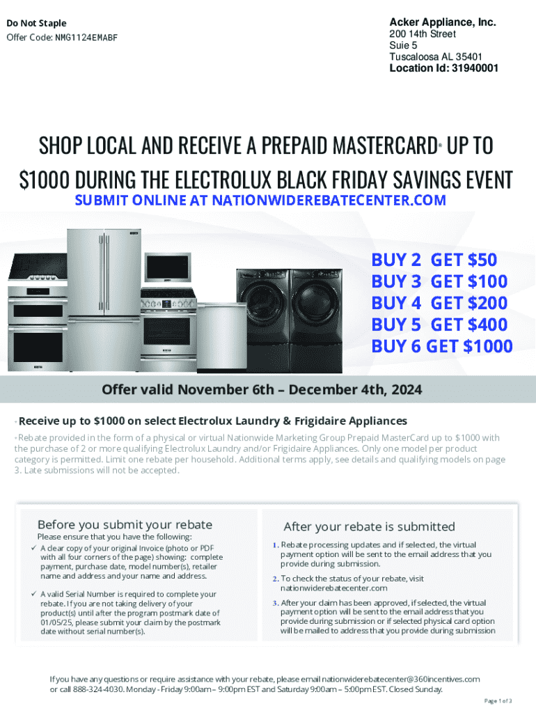 This document outlines the terms and conditions for a rebate offer on select Electrolux Laundry and Frigidaire Appliances, along with the rebate submission process.
