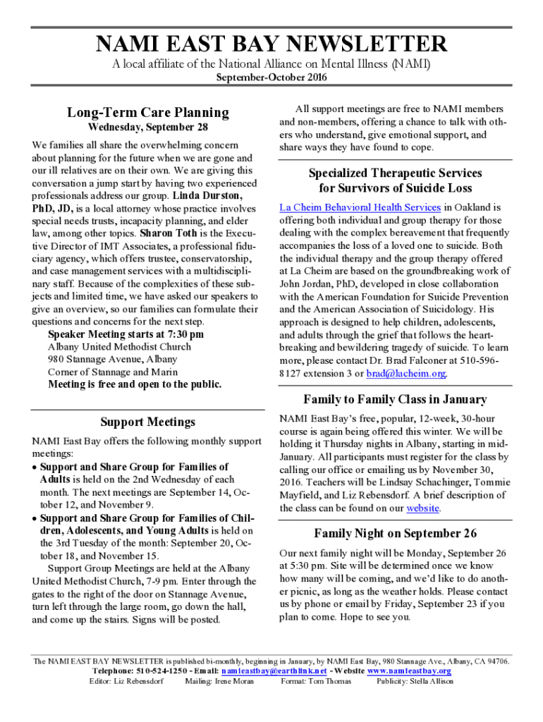In each issue, the NAMI East Bay newsletter dedicates a portion of its content to sharing valuable resources that promote mental health advocacy both locally and nationally. This might include contact information for local mental health service providers, advocacy organizations, and helplines that can offer vital support.