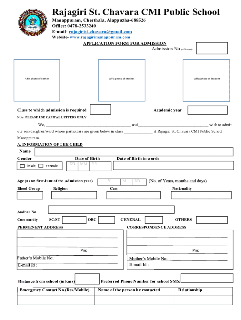 This document serves as the application form for parents to admit their child to Rajagiri St. Chavara CMI Public School, collecting necessary details of the child and family.