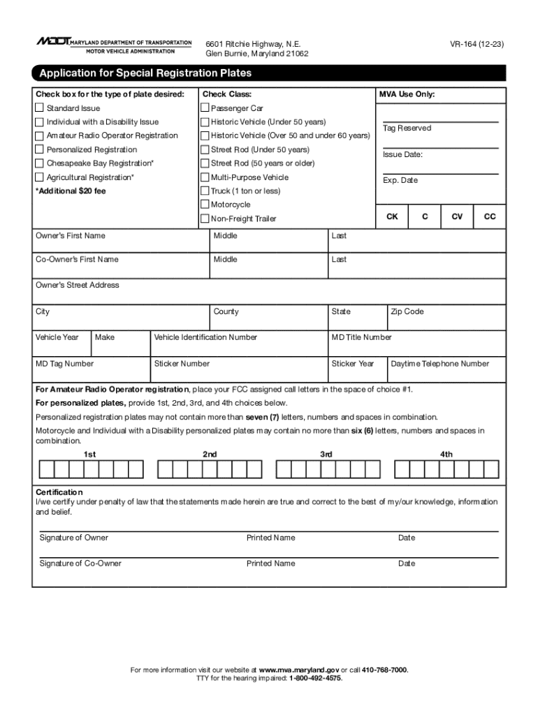This document is an application form for special registration plates in Maryland, allowing individuals to apply for various types of vehicle registration plates, including standard, historic, and