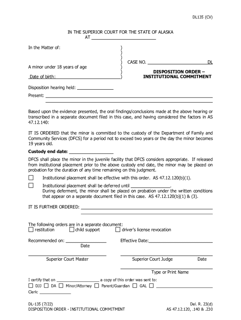 Get the free DL-135 Disposition Order - Institutional Commitment