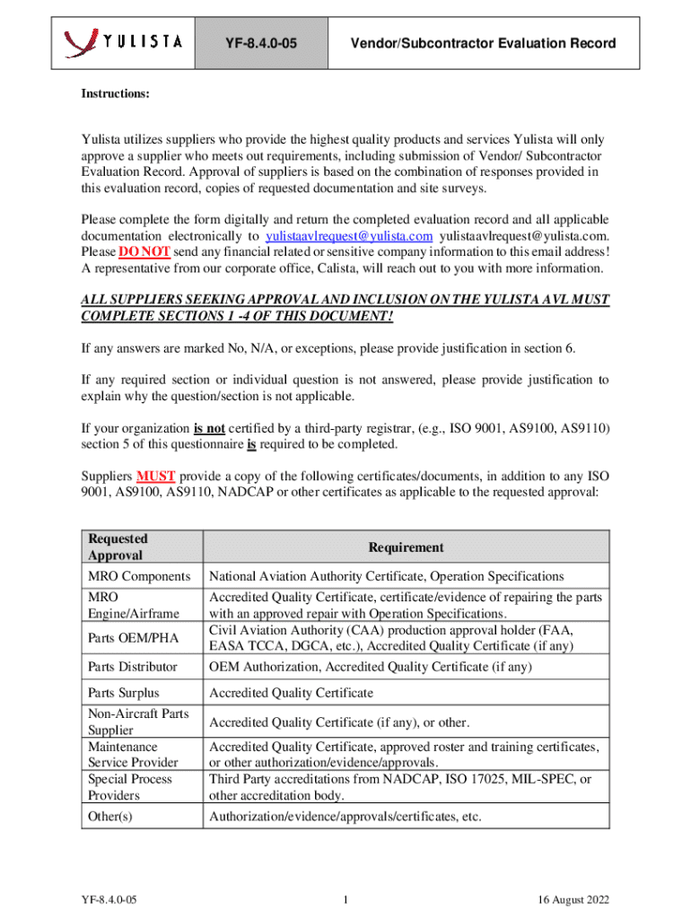 This document serves as a formal evaluation record for vendors and subcontractors, outlining the necessary criteria and information required for approval by Yulista.