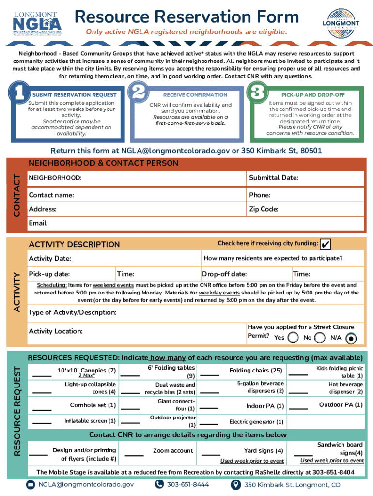 This document serves as a guide for reserving resources for neighborhood activities supported by the NGLA. It outlines the eligibility, reservation process, resource pickup details, and contact information