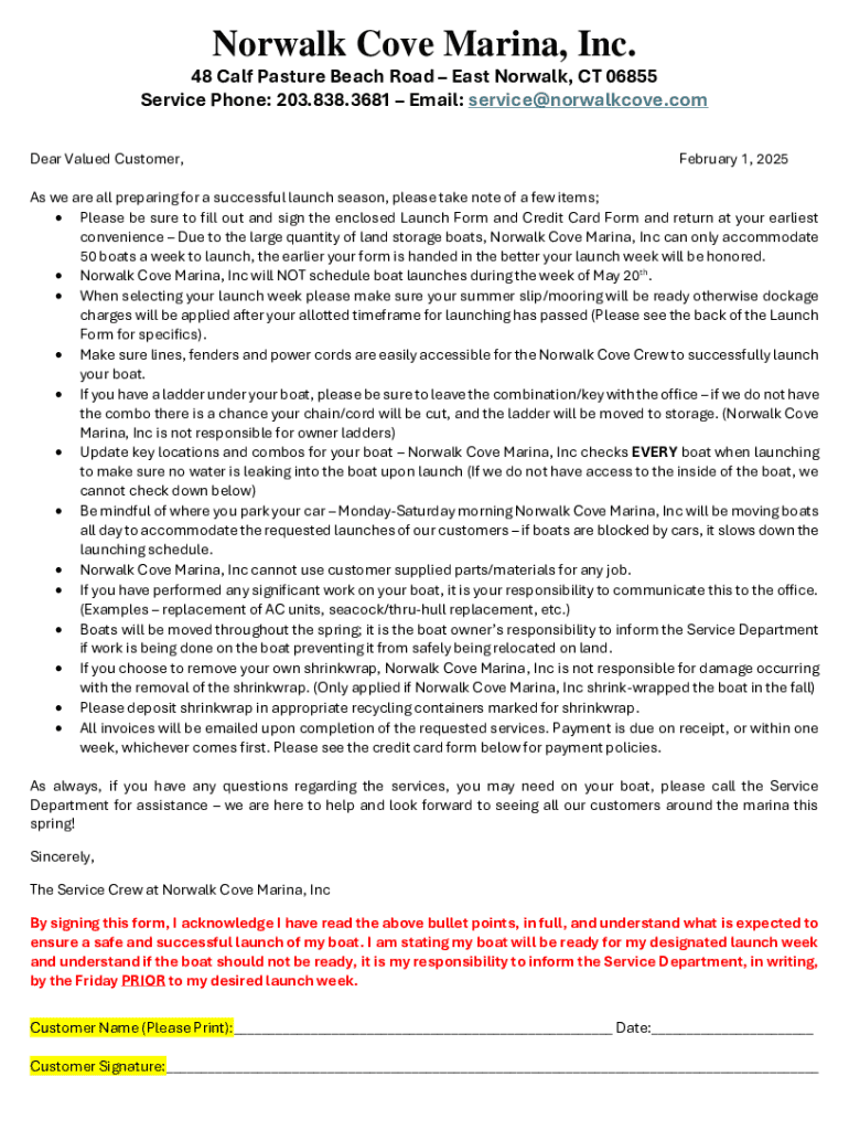 This document outlines the procedures and requirements for launching boats at Norwalk Cove Marina for the 2025 spring season, including forms to be completed, services available, and policies regarding