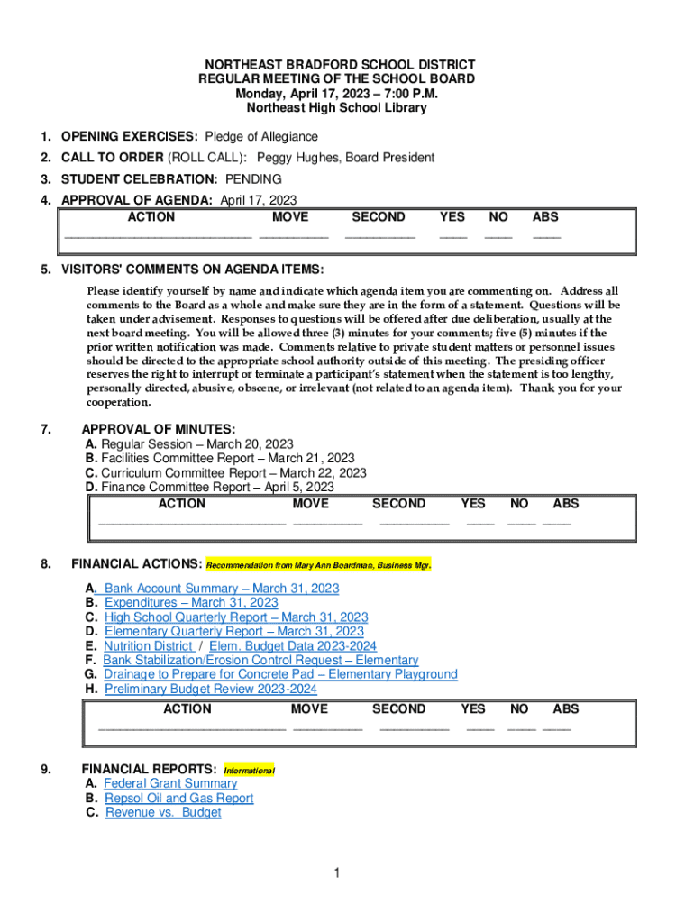 Minutes from the regular meeting of the Northeast Bradford School District Board held on April 17, 2023, including agenda items, financial actions, personnel items, and reports of various committees.
