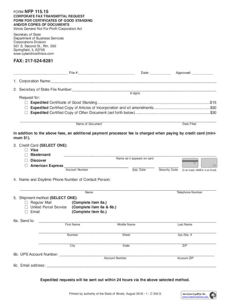 Form used to request certificates of good standing and/or copies of documents for corporations under the Illinois General Not For Profit Corporation Act.