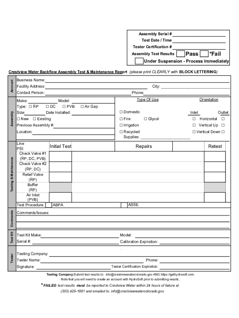 Get the free Crestview Water Backflow Assembly Test & Maintenance Report